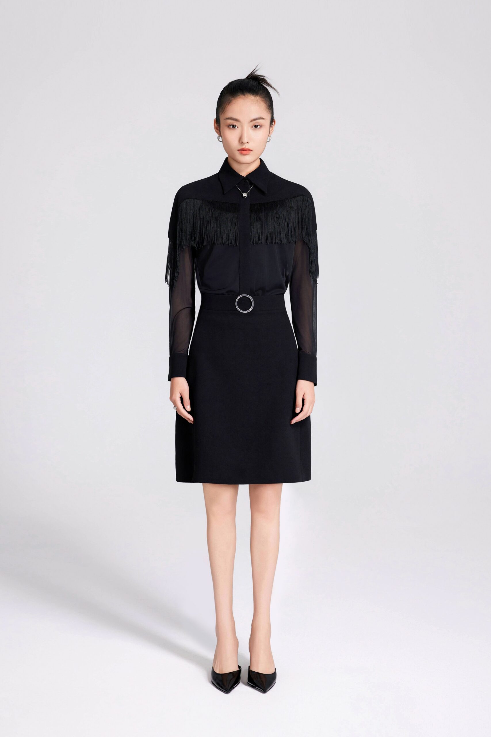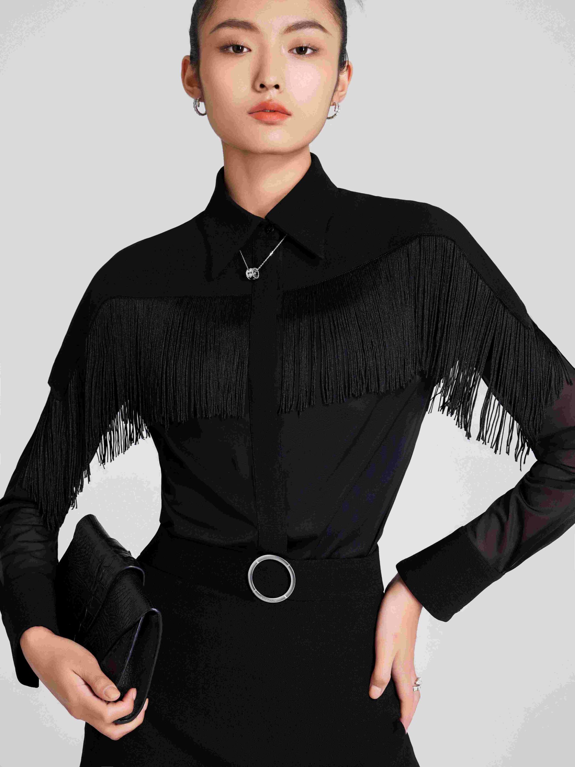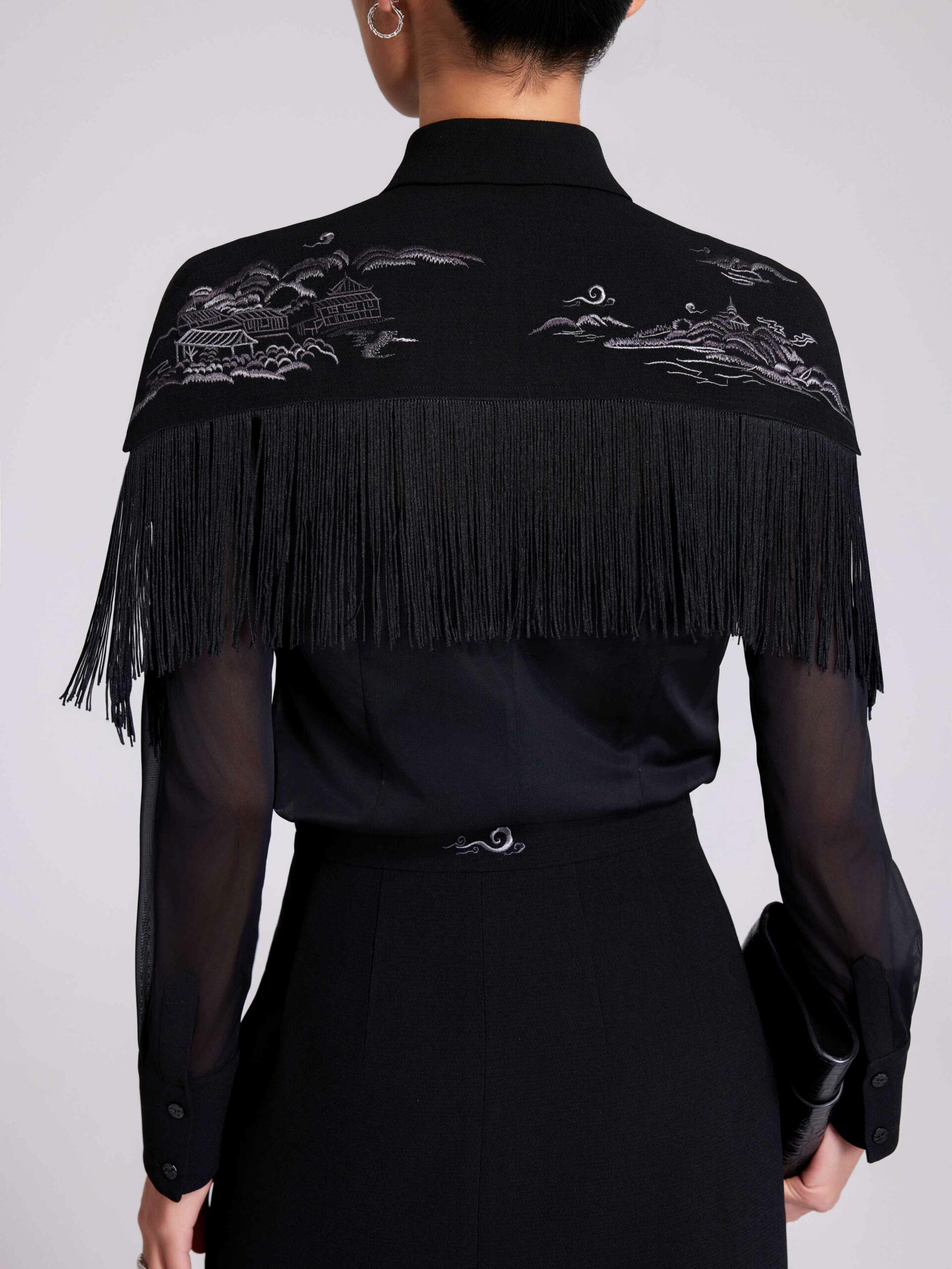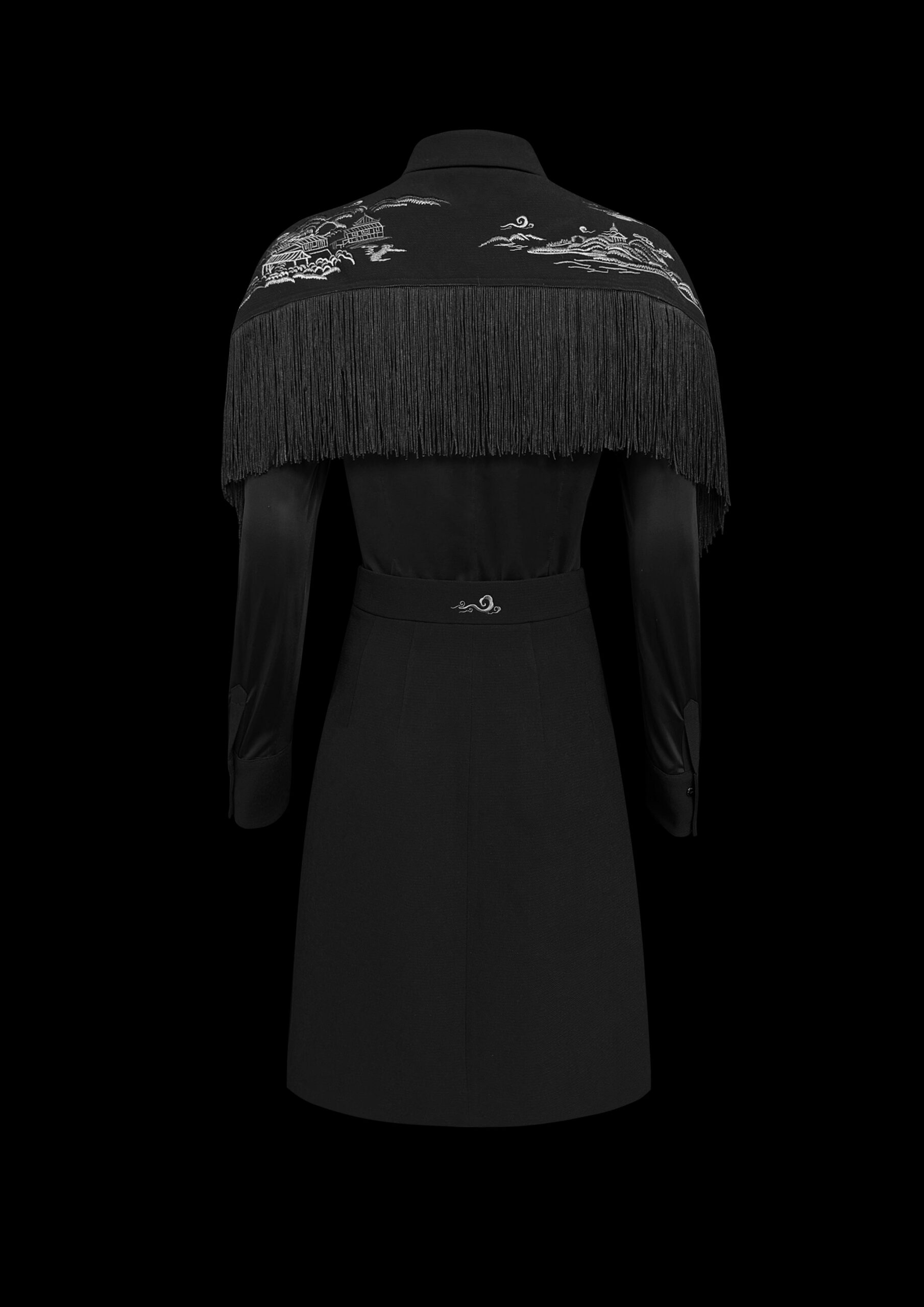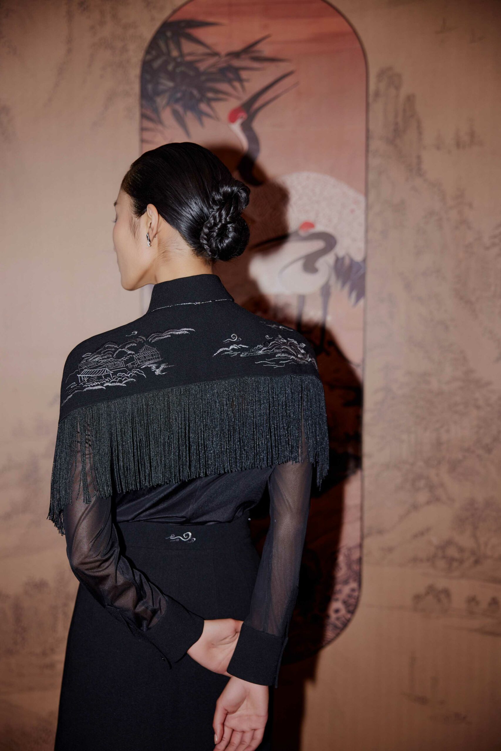 YVAN CHAN aims to convey the concept of culture and regional scenery through clothing, relying on and combining the four famous traditional embroidery styles, and through the design of embroidery and clothing, to bring more people the transmission of culture, and hopes that the fashion of “integration of Chinese and Western” will be loved and recognized by more people. The mountains are full of sounds, a star is in the water, and the dream of the crane is suspected to continue. The black color is combined with the embroidery pattern of Suzhou and Hangzhou’s cloud scenery and mountains and waters, as if you are in the night view of Suzhou and Hangzhou, and with the design of the tassels, it is suspected that you are in a dream of riding a crane to become an immortal.